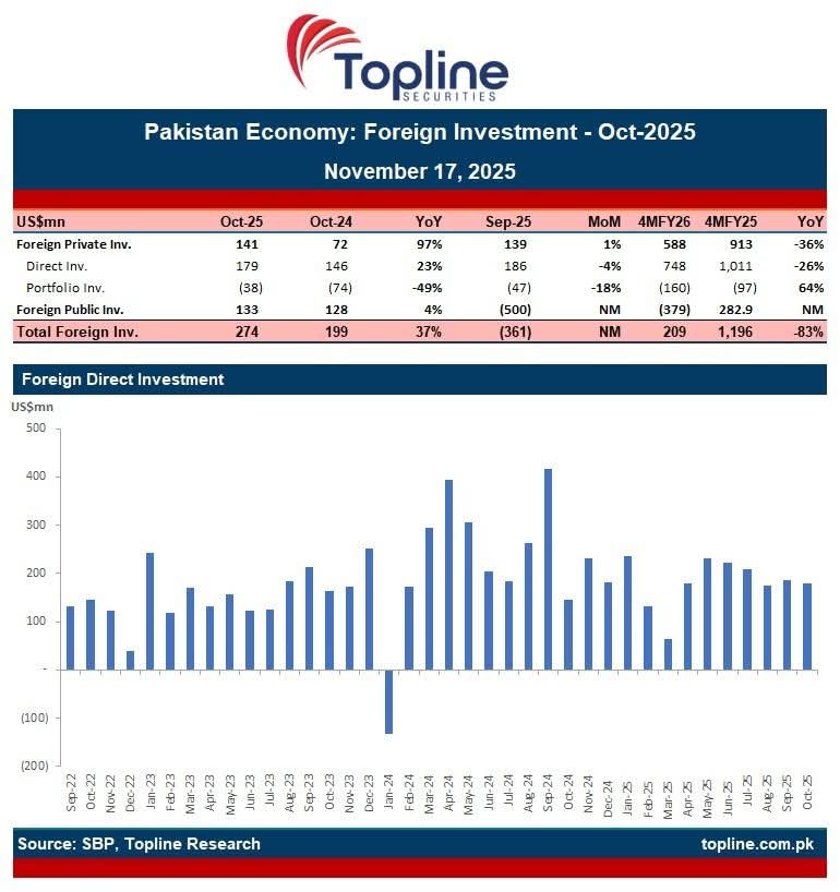 کراچی (اسٹاف رپورٹر) اسٹیٹ بینک آف پاکستان کے مطابق اکتوبر 2025 میں مجموعی غیر ملکی سرمایہ کاری 37 فیصد اضافے کے ساتھ 27 کروڑ 40 لاکھ ڈالر رہی۔ رپورٹ کے مطابق اکتوبر میں براہِ راست غیر ملکی سرمایہ کاری (FDI) 17 کروڑ 90 لاکھ ڈالر رہی، جو ماہانہ بنیاد پر 4 فیصد کمی کے باوجود سالانہ بنیاد پر 23 فیصد اضافہ ظاہر کرتی ہے۔گزشتہ ماہ ستمبر 2025 میں FDI کا حجم 18 کروڑ 60 لاکھ ڈالر تھا، جب کہ اکتوبر 2024 میں یہ سرمایہ کاری 14 کروڑ 60 لاکھ ڈالر رہی تھی۔ مالی سال کے ابتدائی چار ماہ (جولائی تا اکتوبر 2025) میں مجموعی براہِ راست غیر ملکی سرمایہ کاری 26 فیصد کمی کے ساتھ 74 کروڑ 60 لاکھ ڈالر رہی، جب کہ گزشتہ مالی سال کے اسی عرصے میں FDI ایک ارب 1 کروڑ ڈالر ریکارڈ کی گئی تھی۔اسٹیٹ بینک کے مطابق اکتوبر 2025 میں سب سے زیادہ براہِ راست غیر ملکی سرمایہ کاری چین سے موصول ہوئی، جب کہ یو اے ای دوسرے اور ہانگ کانگ تیسرے نمبر پر رہے۔ ماہ کے دوران سرمایہ کاری کے سب سے بڑے حصے کا رخ پاور سیکٹر کی جانب رہا۔ ماہرین کا کہنا ہے کہ موجودہ رحجانات کے پیش نظر مالی سال کے اختتام تک براہِ راست غیر ملکی سرمایہ کاری کے 2 ارب 50 کروڑ ڈالر تک پہنچنے کا امکان ہے۔
